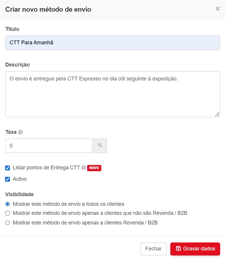 - Selecione a opção Listar Pontos de Entrega CTT caso pretenda que o método de envio permita aos clientes o levantamento da encomenda num Ponto CTT em Portugal (Cacifo Locky, Loja CTT ou Agente Payshop) ou Espanha;
